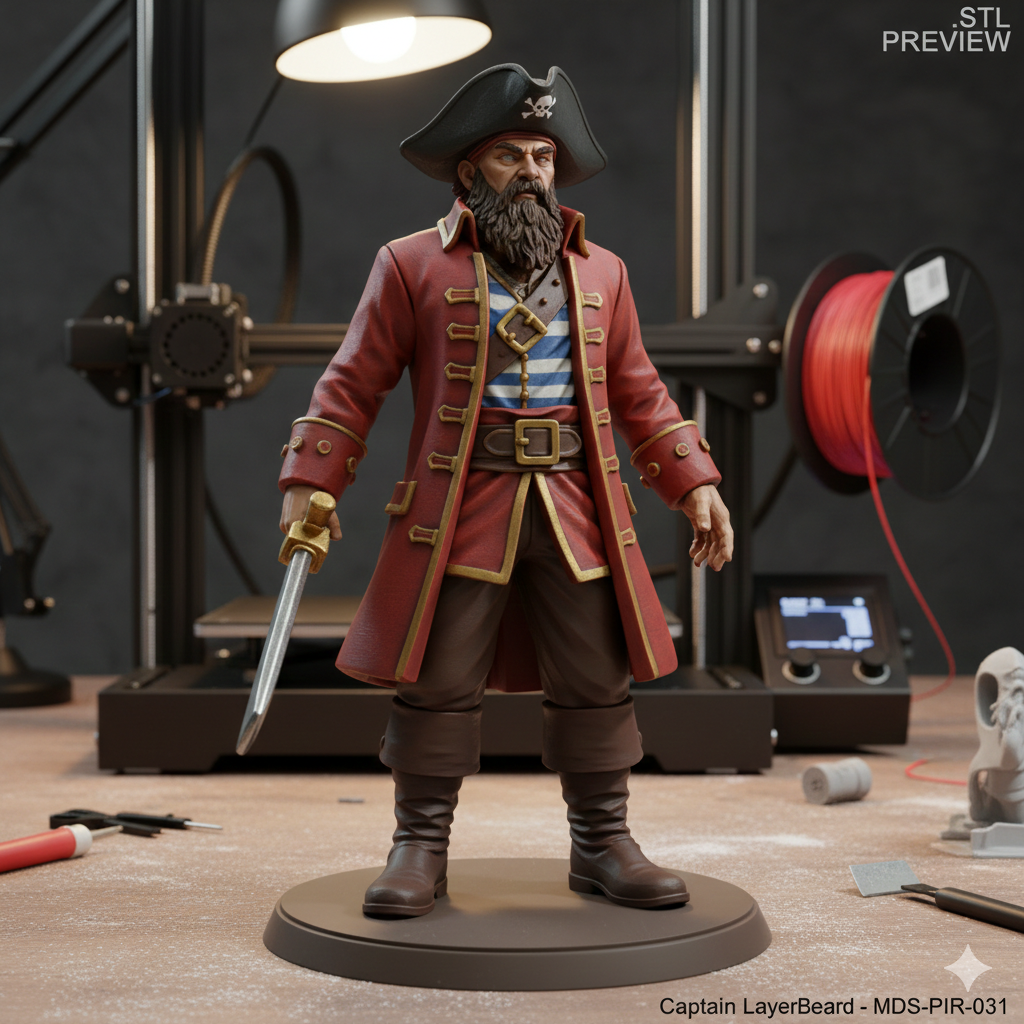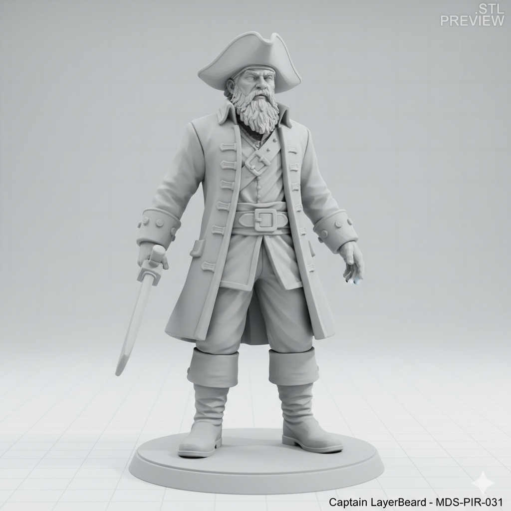„Captain Layerbeard“ ist eine detailreiche Piratenfigur mit Säbel, Dreispitz und markantem Bart. Das Modell wird im FDM-Verfahren gedruckt und überzeugt durch klare Konturen und stabile Bauweise. Perfekt als Sammlerstück, Deko oder Geschenk für Abenteuerfans.
